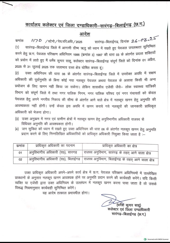 सारंगढ़-बिलाईगढ़ / जिले में ग्रीष्म ऋतु को ध्यान में रखते हुए पेयजल उपलब्धता सुनिश्चित करने हेतु कलेक्टर एवं जिला दंडाधिकारी धर्मेश कुमार साहू ने छत्तीसगढ़ पेयजल परिरक्षण अधिनियम 1986 (क्रमांक 3), 1987 की धारा 03 के तहत सारंगढ़ बिलाईगढ़ संपूर्ण जिले को 01 अप्रैल 2025 से 31 जुलाई 2025 तक जलाभावग्रस्त क्षेत्र घोषित किया है। इस आदेश को जिले में तत्काल लागू किया गया है। इस अवधि में अधिनियम की धारा 06 के अंतर्गत सारंगढ़ बिलाईगढ जिले में सक्षम अधिकारी की पूर्वानुमति के बिना कोई नया नलकूप (बोर) पेयजल अथवा पेयजल के अलावा किसी भी अन्य प्रयोजन के लिए खनन नहीं किया जा सकेगा, लेकिन शासकीय एजेंसी जैसे- लोक स्वास्थ्य यांत्रिकी विभाग को संपूर्ण जिले में तथा नगरपालिका परिषद एवं नगर पंचायतों को केवल पेयजल हेतु अपने नगरीय निकाय की सीमा के अंतर्गत आने वाले क्षेत्र में नलकूप खनन हेतु अनुमति की आवश्यकता नहीं होगी। उन्हें केवल इस अवधि में खनन कराये गये नलकूपों की जानकारी प्राधिकृत अधिकारी को भेजना होगा।