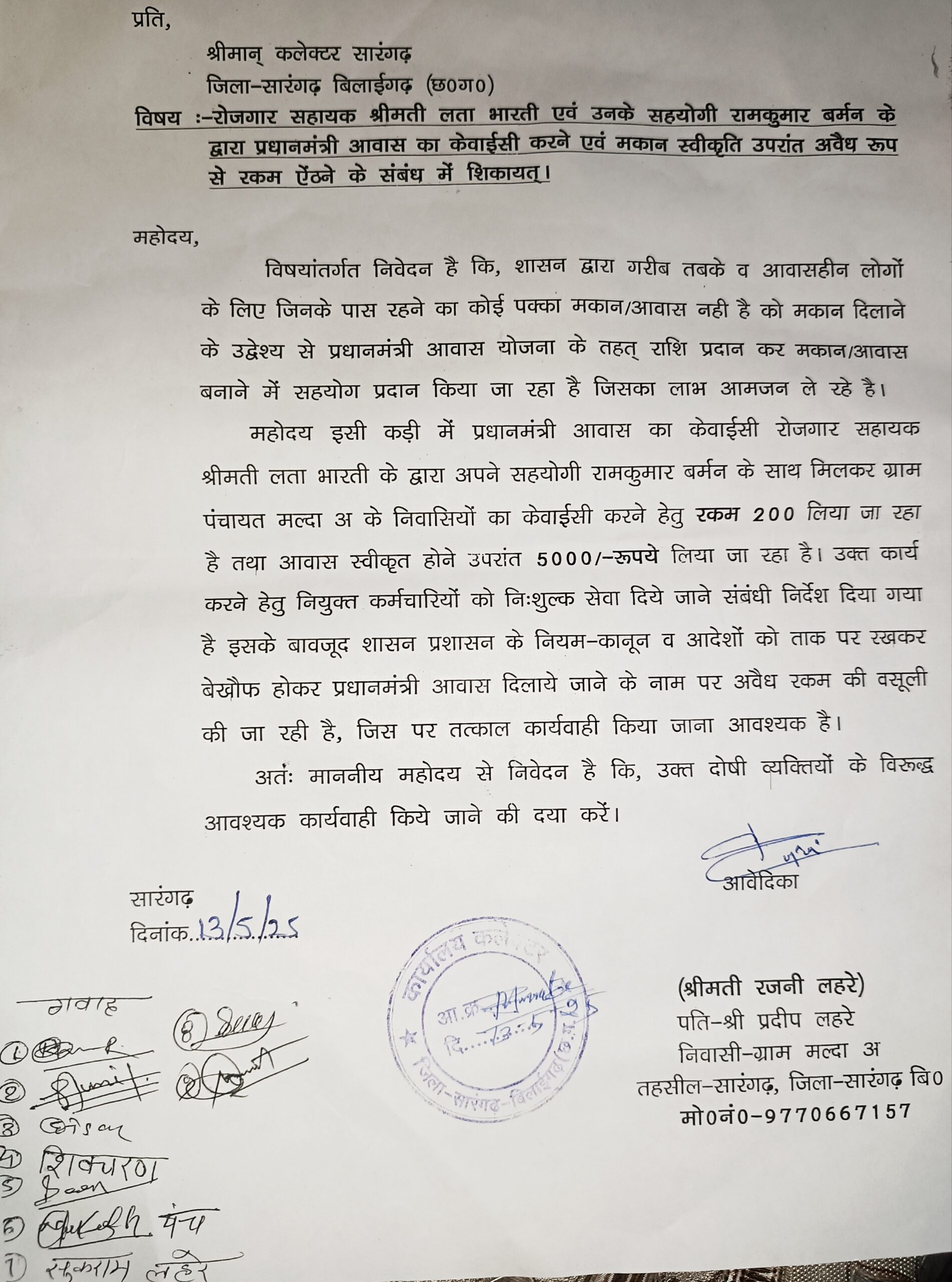 जिला सारंगढ़ बिलाईगढ़ के अंतर्गत आने वाला ग्राम पंचायत मल्दा अ से मामला निकल कर सामने आया है जहाँ पर कुछ दिनों पहले प्रधानमंत्री आवास योजना के अंतर्गत गांव – गांव में केवाईसी हो रही थी जों की शासन गरीब तबके आवासहीन लोगों के लिए जिनके पास रहने के लिए कोई पक्का मकान /आवास नहीं है जो मकान दिलाने के उद्देश्य से प्रधानमंत्री आवास योजना के तहत राशि प्रदान कर मकान/आवास बनाने में सहयोग किया जा रहा है जिसका लाभ आमजन ले रहे हैं! वहीँ ग्राम पंचायत मल्दा अ में प्रधानमंत्री आवास का केवाईसी रोजगार सहायक श्रीमती लता भारती के द्वारा अपने सहयोगी रामकुमार बर्मन के साथ मिलकर ग्राम पंचायत मल्दा अ के निवासियों का केवाईसी करने हेतु रकम 200 -200 एक – एक केवाईसी पर लिया जा रहा है तथा आवास स्वीकृत पर ₹5000 लिया जा रहा है! उक्त कार्य करने हेतु नियुक्त कर्मचारियों को शासन द्वारा निशुल्क सेवा दिए जाने संबंधी निर्देश दिया गया है के बावजूद शासन प्रशासन के नियम – कानून व आदेश का तार-तार कर बैखोप होकर प्रधानमंत्री आवास दिलाने के नाम पर अवैध रकम की वसूली की जा रही है जिस पर ग्रामीण वासियों द्वारा कलेक्टर को शिकायत भी किया गया और जल्द से जल्द कार्यवाही करने की मांग की गई !!