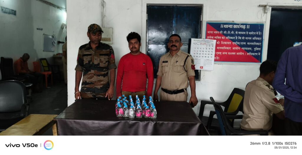 1. अप0क्रं0 251/2025 धारा- 34(2) आबकारी एक्ट में दिनांक- 30.05.2025 को जरिये मुखबिर सूचना मिला कि ग्राम साराडीह में एक व्यक्ति घर आंगन में अवैध शराब बिक्री कर रहा है कि सूचना पर हमराह स्टाफ एवं गवाहान के घटना स्थल साराडीह जाकर घेराबंदी कर रेड कार्यवाही कर रंजित टाण्डे पिता चीनीलाल टाण्डे उम्र 34 वर्ष सा0 साराडीह के कब्जे से एक हरा रंग के बाटल में भरा एक लीटर कच्ची महुआ शराब किमती 100 रूपया, सफेद पन्नी मे पेक किया कच्ची महुआ शराब 57 पाउच प्रत्येक पाउच में 150 एमएल भरा कुल शराब 8.550 लीटर किमती 900 रूपया, दो शीशी देशी प्लेन शराब प्रत्येक शीशी में 180 एमएल भरा कुल 360 एमएल किमती 160 रूपया , 06 बाटल सिम्बा० बियर प्रत्येक बाटल में 650 एमएल भरा कुल बियर 3.900 लीटर किमती 1200 रूपया कुल जुमला महुआ शराब 9.550 लीटर, 360 एमएल देशी प्लेन शराब 3.900 लीटर बियर कुल किमती 2360 रूपये को जप्त किया गया बाद आरोपी को विधिवत गिरफ्तार कर न्यायिक रिमाण्ड पर भेजा गया।