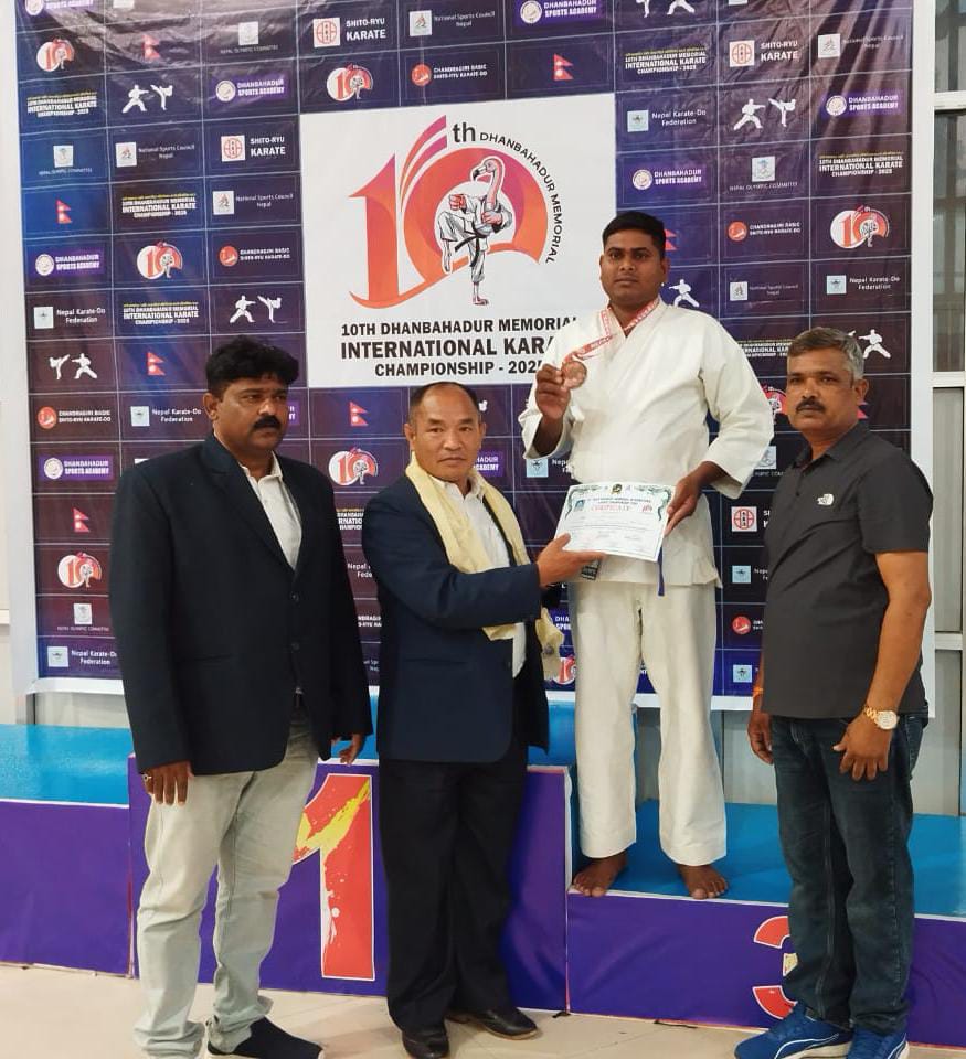 दी सोतोकान कराटे डो स्पोर्ट्स फेडरेशन के खिलाड़ी ने भारत का प्रतिनिधित्व करते हुए एवं अंतर्राष्ट्रीय कोच आशीष भारद्वाज की देखरेख में जिले के धनीराम निराला ने सीनियर पुरुष 75 केजी भार वर्ग कुमीते में तृतीय स्थान प्राप्त किया, वहीँ विजेता खिलाडी धनीराम निराला को मुख्य अतिथि हीरासिंह डोंगल रिटायर असिस्टेंट डायरेक्टर स्पोर्ट्स अथॉरिटी नेपाल ने पदक व प्रमाण पत्र देकर उत्साह वर्धन किया। इस खुशी में जिले के पत्रकार बिरादरी ने धनीराम निराला विजेता का पुष्प माला पहनाकर भव्य स्वागत किया और गले मिल कर बधाई एवं शुभकामनायें दिए।
