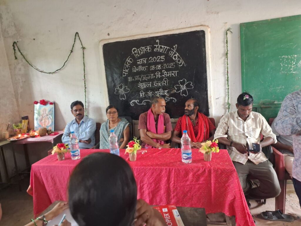 बरमकेला/छत्तीसगढ़ स्कूल शिक्षा विभाग द्वारा निर्देशित तथा कार्यालय कलेक्टर एवं जिला मिशन संचालक समग्र शिक्षा रायगढ़ के परिपालन में दिनांक 8 अगस्त 2025 को शासकीय पूर्व माध्यमिक विद्यालय सेमरा में मेगा पालक शिक्षक बैठक का आयोजन किया गया जिसमें शाला विकास समिति के अध्यक्ष एवं सदस्यों के साथ-साथ बड़ी संख्या में विद्यार्थियों के पालक उपस्थित हुए इस अवसर पर पालकों नें बच्चों के शिक्षा गुणवत्ता पर चर्चा, अनुशासन, साफ सफाई,शाला परिसर की साफ सफाई पर विशेष ध्यान आकर्षित किऐ।