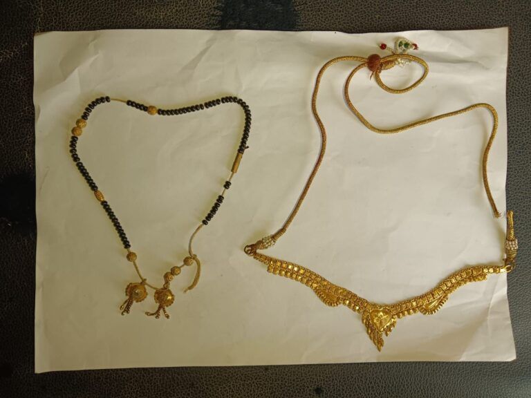 कि सूचना पर रवाना होकर संदेही/आरोपी भूलोचन प्रसाद रत्नाकर पिता शंकर रत्नाकर उम्र 24 वर्ष साकिन पाट थाना कोसीर को कडाई से पुछताछ करने पर अपना जुर्म स्वीकार कर मेमोरेण्डम कथन लिया गया जो अपने कथन में बताया कि ग्राम पाट के सक्राम नाला के किनारे मिटटी में खोदकर रखा हूं बरामद करा देता हूं कहने पर मौकास्थल पहुंचकर उक्त चोरी गयी एक तोला सोने की हार एवं एक सोने की माला कीमती लगभग 1,20,000 रू तथा घटना में प्रयुक्त ब्लेड को आरोपी द्वारा बरामद करने पर समक्ष गवाहन जप्त कर कब्जा पुलिस में लिया गया है आरोपी भूलोचन रत्नाकर पिता शंकर रत्नाकर उम्र 24 साल ग्राम पाट थाना कोसीर को गिरप्तार कर सूचना परिजन को देकर न्यायिक रिमाण्ड पर भेजा गया है ।उक्त कार्यवाही में थाना प्रभारी कोसीर निरीक्षक श्रीमती सुनीता नाग बंजारे , प्रआर 78 मनींजर सिदार आरक्षक राजकुमार साहू, विकास पटेल,धनसाय कुर्रे,धनंजय खाण्डेकर,गिरजा शंकर देवांगन, उमेश जांगडे का विशेष योगदान रहा!!