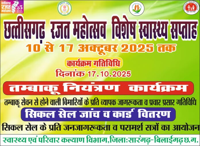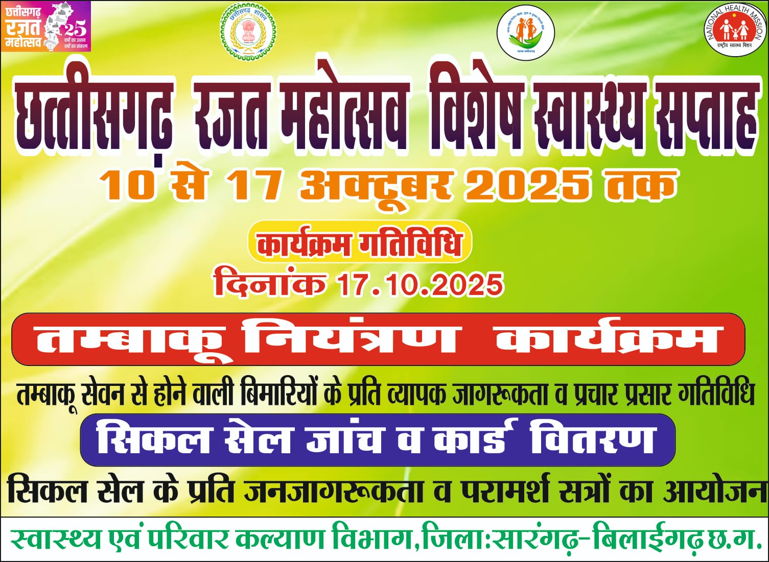 सारंगढ़ बिलाईगढ़ 17 अक्टूबर 2025/छत्तीसगढ़ रजत जयंती पर्व में स्वास्थ्य विभाग द्वारा तंबाखू मुक्त युवा अभियान 3.0 के तहत डॉ एफ आर निराला (मुख्य चिकित्सा एवं स्वास्थ्य अधिकारी) के मार्गदर्शन में कोटपा अधिनियम 2003 के तहत जिले के सभी ब्लॉक में प्रवर्तन दल के द्वारा शैक्षणिक संस्थानो और सार्वजनिक जगहों में चालानी कार्यवाही किया गया। इस दौरान स्कूलों में बच्चों को धूम्रपान निषेध और तंबाखू मुक्त शपथ दिलाई गई।