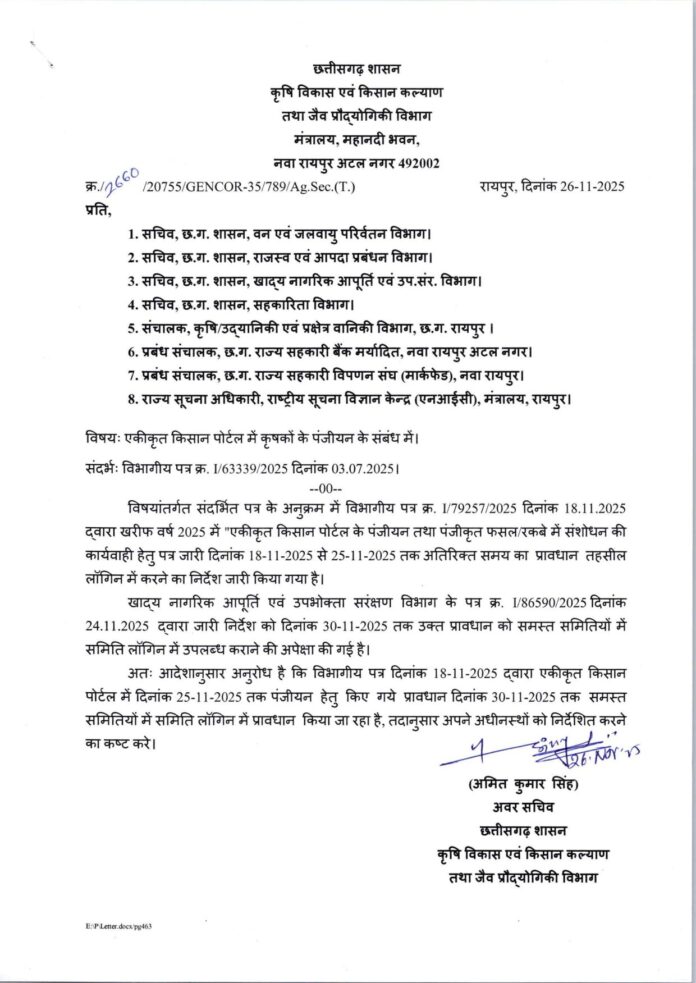 सारंगढ़ बिलाईगढ़, 26 नवंबर 2025/खरीफ वर्ष 2025 में “एकीकृत किसान पोर्टल के पंजीयन तथा पंजीकृत फसल रकबे में संशोधन की कार्यवाही 18 नवंबर से 25 नवंबर 2025 तक अतिरिक्त समय का प्रावधान तहसील लॉगिन में करने का निर्देश जारी किया गया था, जिसे खाद्य नागरिक आपूर्ति एवं उपभोक्ता सरंक्षण विभाग के पत्र क्र. 1/86590/2025 दिनांक 24.11.2025 द्वारा जारी निर्देश को दिनांक 30-11-2025 तक उक्त प्रावधान को समस्त समितियों में समिति लॉगिन में उपलब्ध कराने कहा गया है। विभागीय पत्र दिनांक 18-11-2025 द्वारा एकीकृत किसान पोर्टल में दिनांक 25-11-2025 तक पंजीयन हेतु किए गये प्रावधान दिनांक 30-11-2025 तक समस्त समितियों में समिति लॉगिन में प्रावधान किया जा रहा है। कृषि विभाग ने इस संबंध में पत्र जारी किया है।